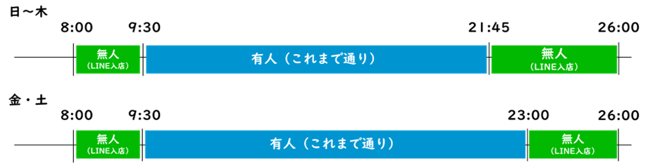 ※無人営業時間は、キャッシュレス決済のみ(クレジットカード、電子マネー、二次元バーコード決済、現金不可)