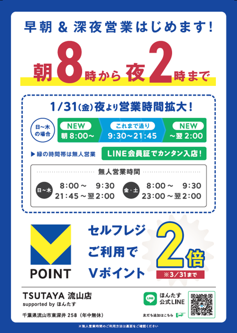 「TSUTAYA流山店」に店舗運営省人化ソリューション「ほんたす」を 1月31日より導入、時間延長営業を開始