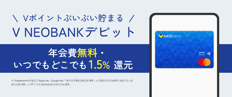 新しい「V NEOBANKデビットカード」なら、いつでも・どこでもポイント還元率は1.5%。