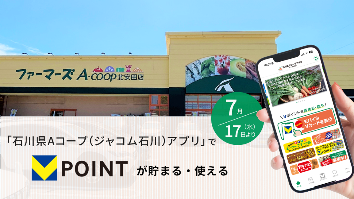 JA全農グループとして石川県で食品スーパーマーケットを展開する株式会社ジャコム石川(本社:石川県金沢市、代表取締役社長:松本外司、以下「ジャコム石川」)と、CCCMKホールディングス株式会社(本社:東京都渋谷区、代表取締役社長 兼 CEO:髙橋誉則、以下「CCCMKHD」)は、ジャコム石川が提供する「石川県Aコープ(ジャコム石川)アプリ」にてVポイントが貯まる・使えるサービスを2024年7月17日(水)より開始いたします。