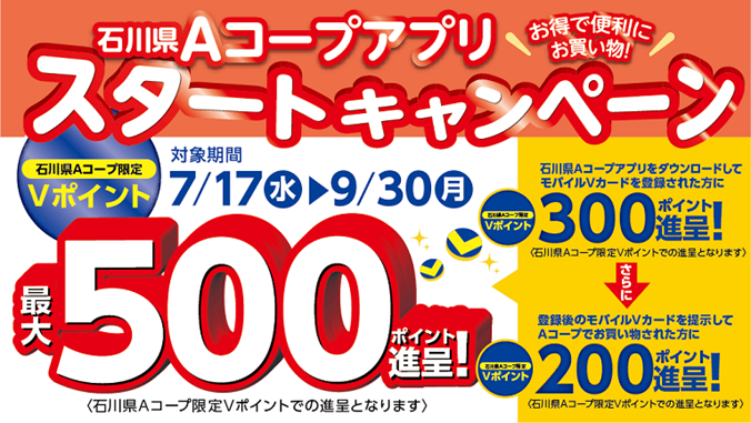 キャンペーン期間中に「石川県Aコープ(ジャコム石川)アプリ」を新規ダウンロードし、Vポイントの利用手続きをした上で、石川県の「Aコープ」でモバイルVカードをご提示いただくと、さらに200ポイントがもらえます。