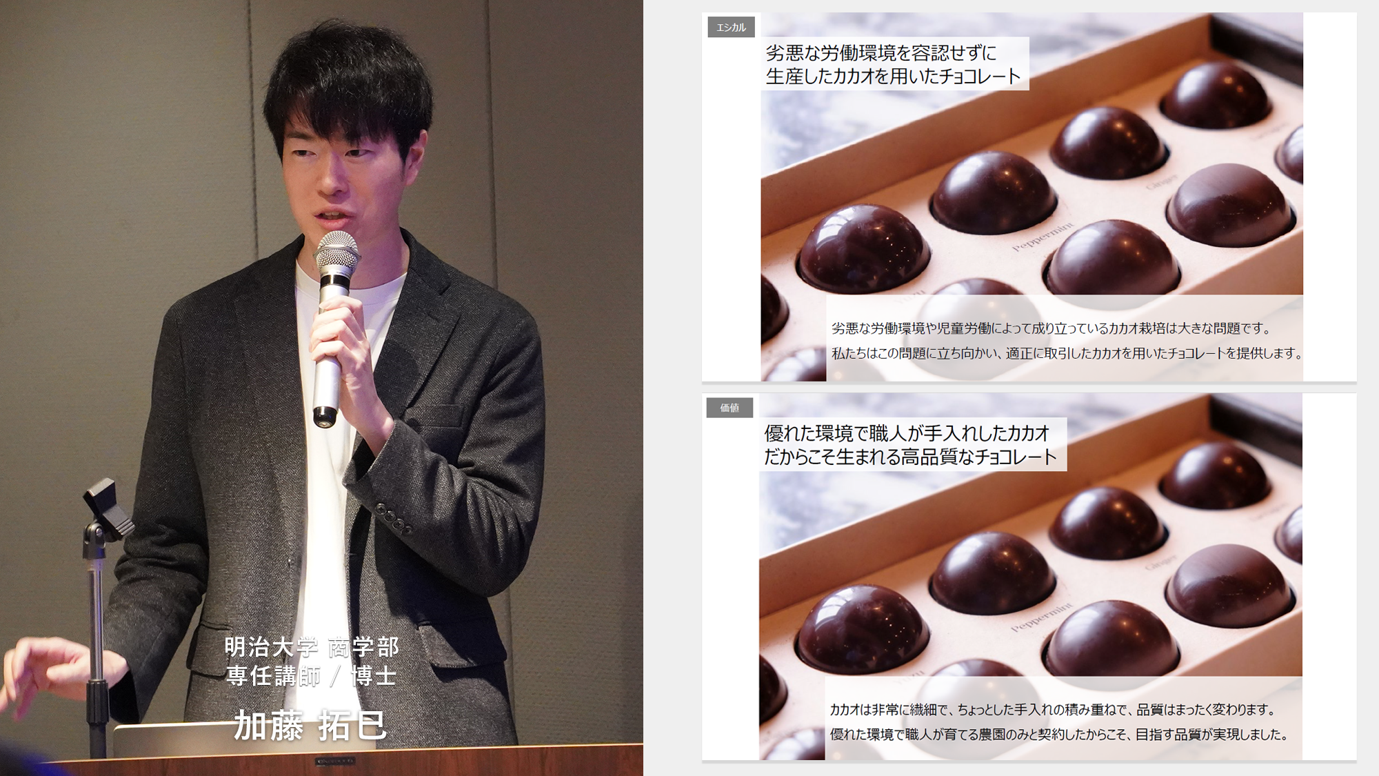 後半では「コンセプトに基づく価値づくりの方法論とエシカル消費への適用」と題し、明治大学 商学部 専任講師 / 博士 加藤拓巳さまより、マーケティングにおける消費者価値をもとにしたコンセプトづくりの重要性と、エシカル商品における消費者価値についての最新の研究結果をご共有いただきました。