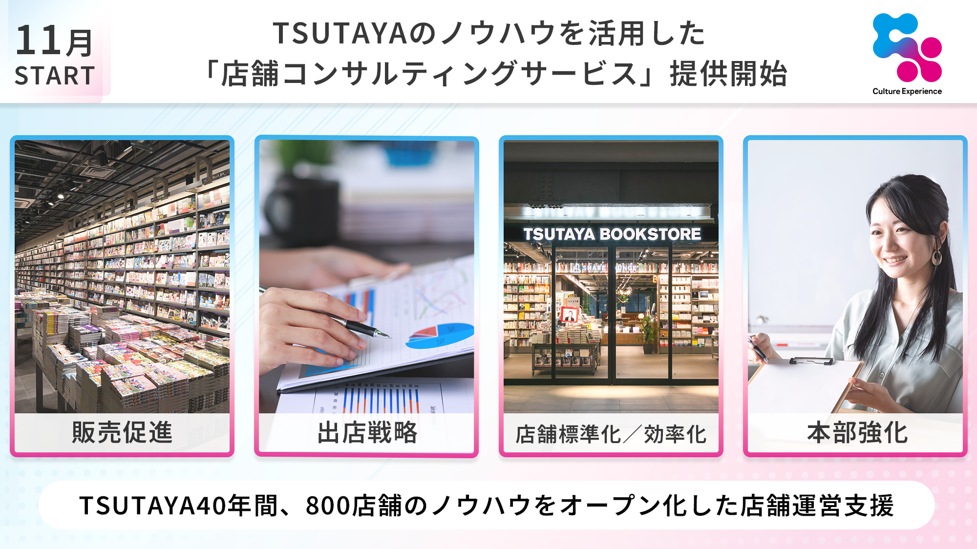 カルチュア・エクスペリエンス株式会社(本社:東京都千代田区、代表取締役社長:鎌浦 慎一郎、以下「CX」)は、これまで40年間におよび全国各地の加盟企業様とともに約800店舗の「TSUTAYA」を運営するなかで培った運営力、企画力、分析力などのCXが持つ独自のノウハウをオープンに活用し、店舗を運営する他事業者様に向けて店舗運営を多方面からサポートする「店舗コンサルティングサービス」を2024年11月より開始いたします。