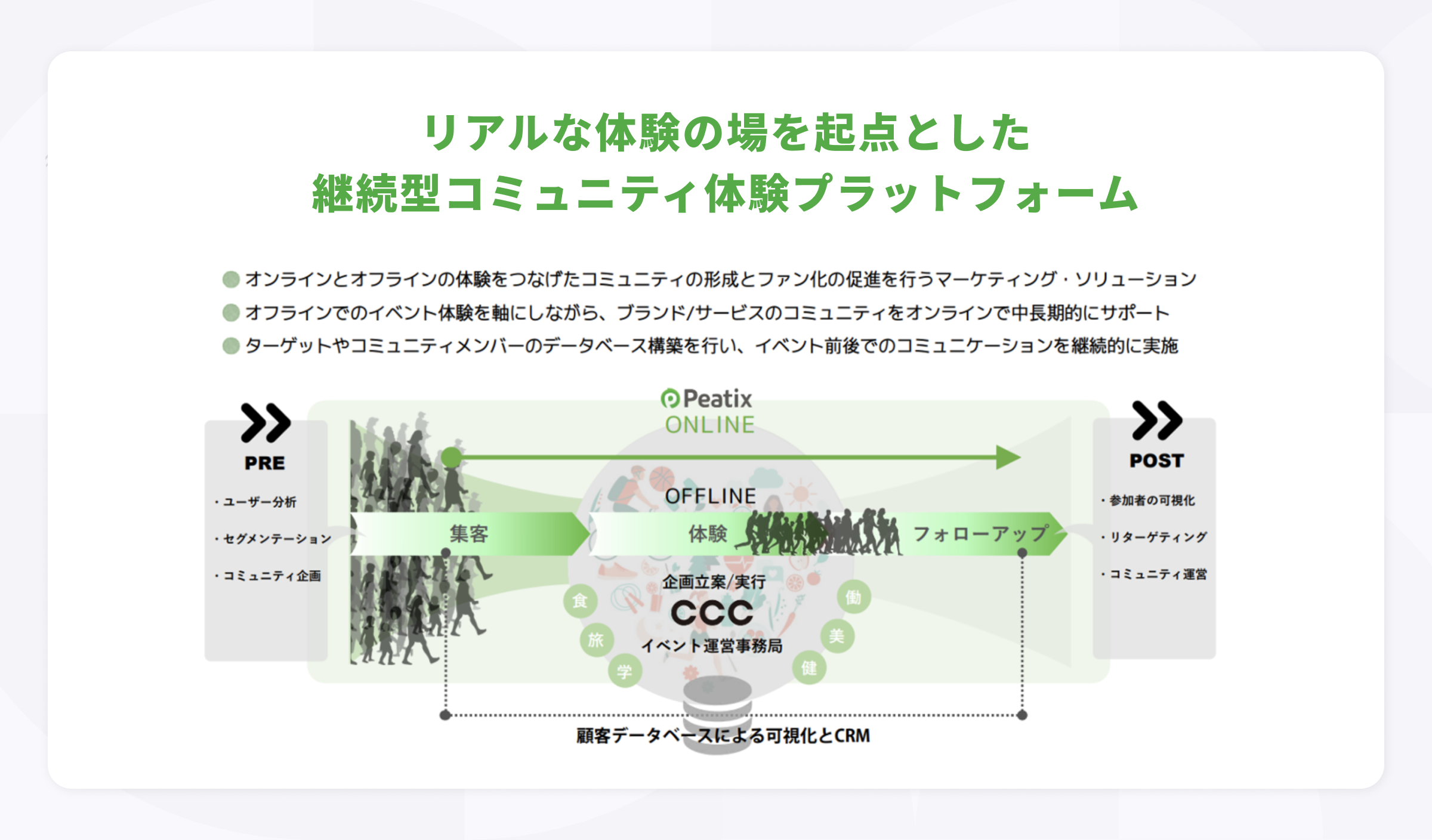 ピーティックスとCCCは、業務提携を通じて、CCCが顧客エンゲージメントを高めるためのイベント企画・運営を行い、ピーティックスのプラットフォームで企業とコミュニティメンバー間の双方向のコミュニケーションを活発化させることで、サービス・製品への理解と愛着を深めます。また、CCCが有するデータベースマーケティングの知見をもとに、イベント参加前の潜在顧客へのアプローチや参加後のフォローアップの全体設計を行い、コミュニティの発展によるビジネスの成長に貢献いたします。