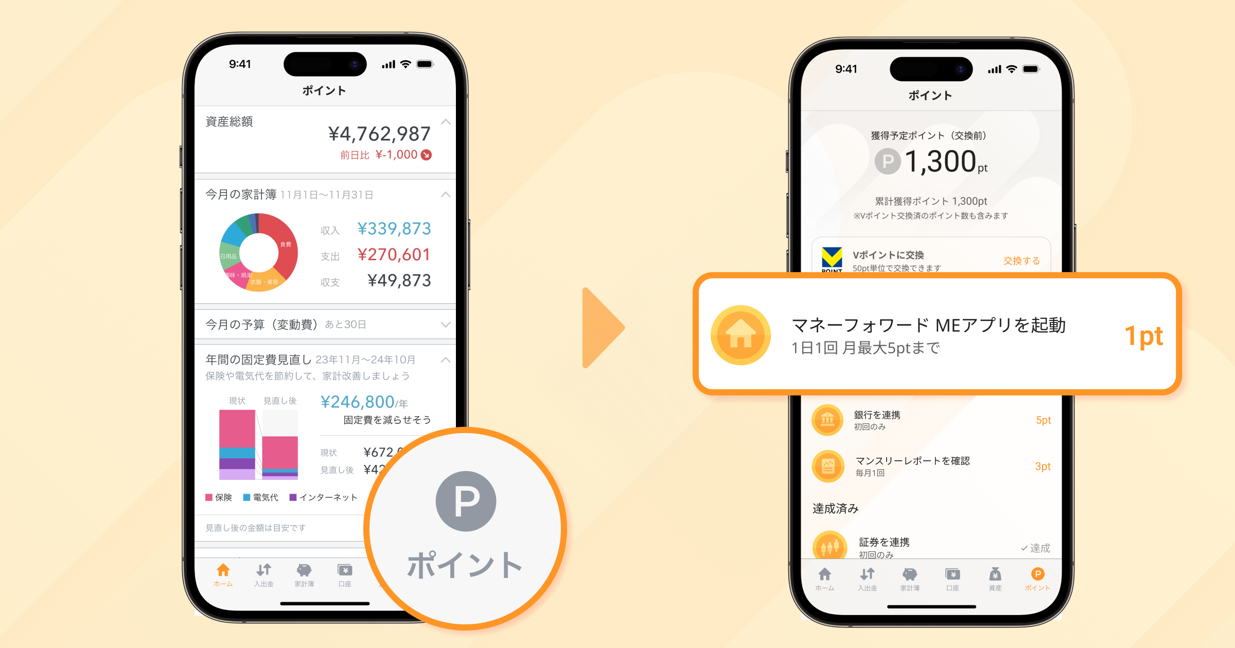 ※3:『マネーフォワード ME』で表示されるポイントが貯まるアクション(ポイントチャレンジ)は、ユーザーのご利用状況によって異なります。